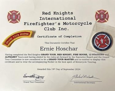 When the club was young, word of mouth was the easiest way to tell others about it. This meant that the members had to get out to visit other firefighters, and one of the best ways to do that was to visit Fire Stations. Someone came up with the idea of rewarding members who made several visits with a certificate and a pin. Proof of these visits was needed, so the idea of the Grand Tour was born. After visiting Fire Stations beginning with the letters G R A N D T O U R members were given a pin. Over the years, other rides were added, RED KNIGHT and FIREHOUSE rides, and for members from remote areas, a ride to visit TWELVE STATIONS beginning with any letter of the alphabet. For those who want the ultimate, you can choose the ALPHABET tour which includes all the letters in the alphabet. In 2024 LOYAL TO OUR DUTY was added only for anyone who is a Grand Tour Master.